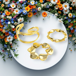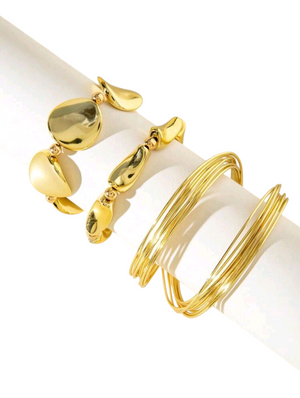 Home 3-Piece Bold Gold Geometric Bracelet Set – Chunky Wire Hoop & Asymmetrical Beaded Cuff Jewelry