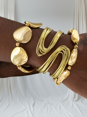 3-Piece Bold Gold Geometric Bracelet Set – Chunky Wire Hoop & Asymmetrical Beaded Cuff Jewelry